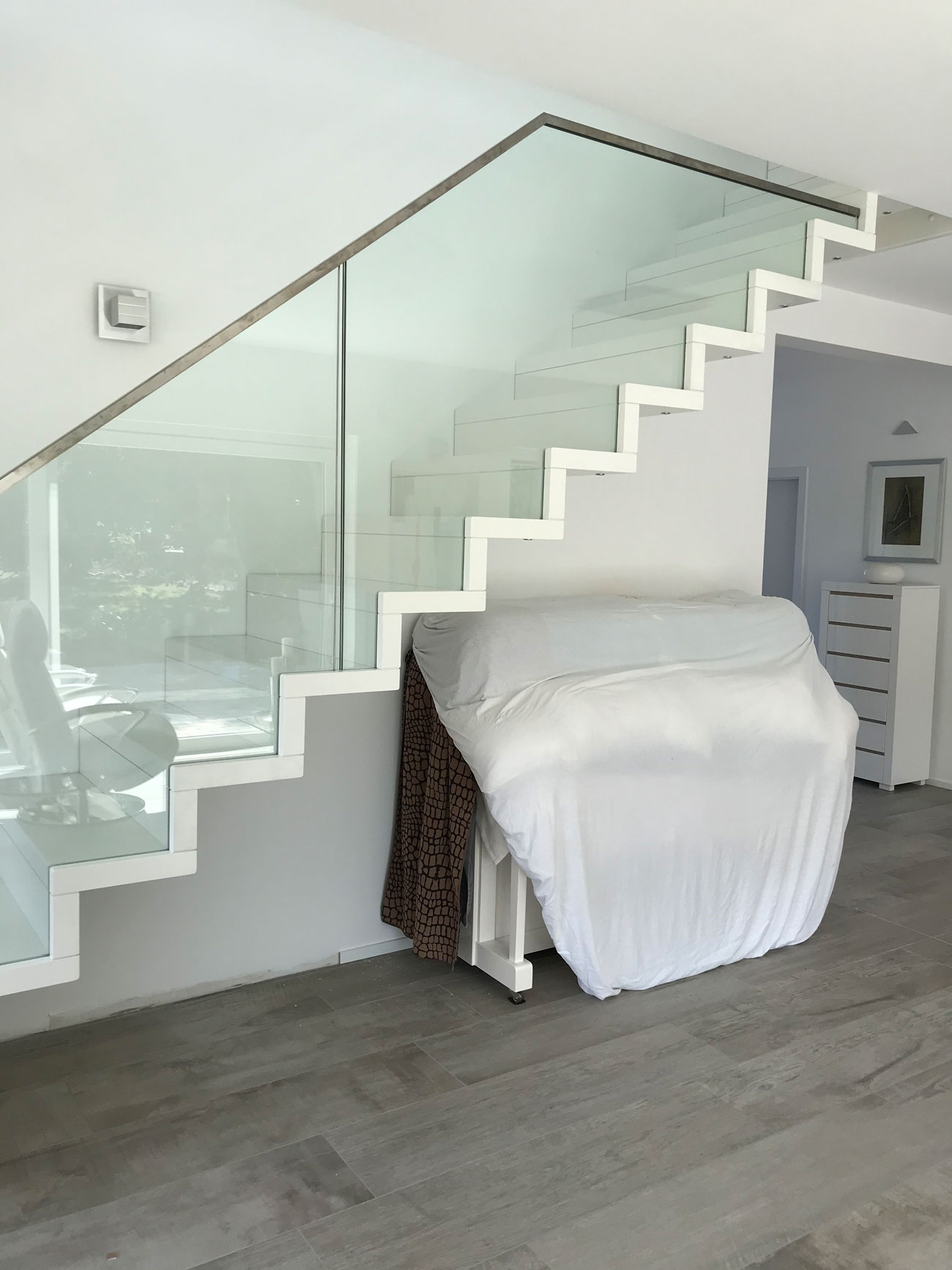 Faltwerktreppe in weiß mit Ganzglasgeländer Faltwerktreppe in weiß mit Ganzglasgeländer -