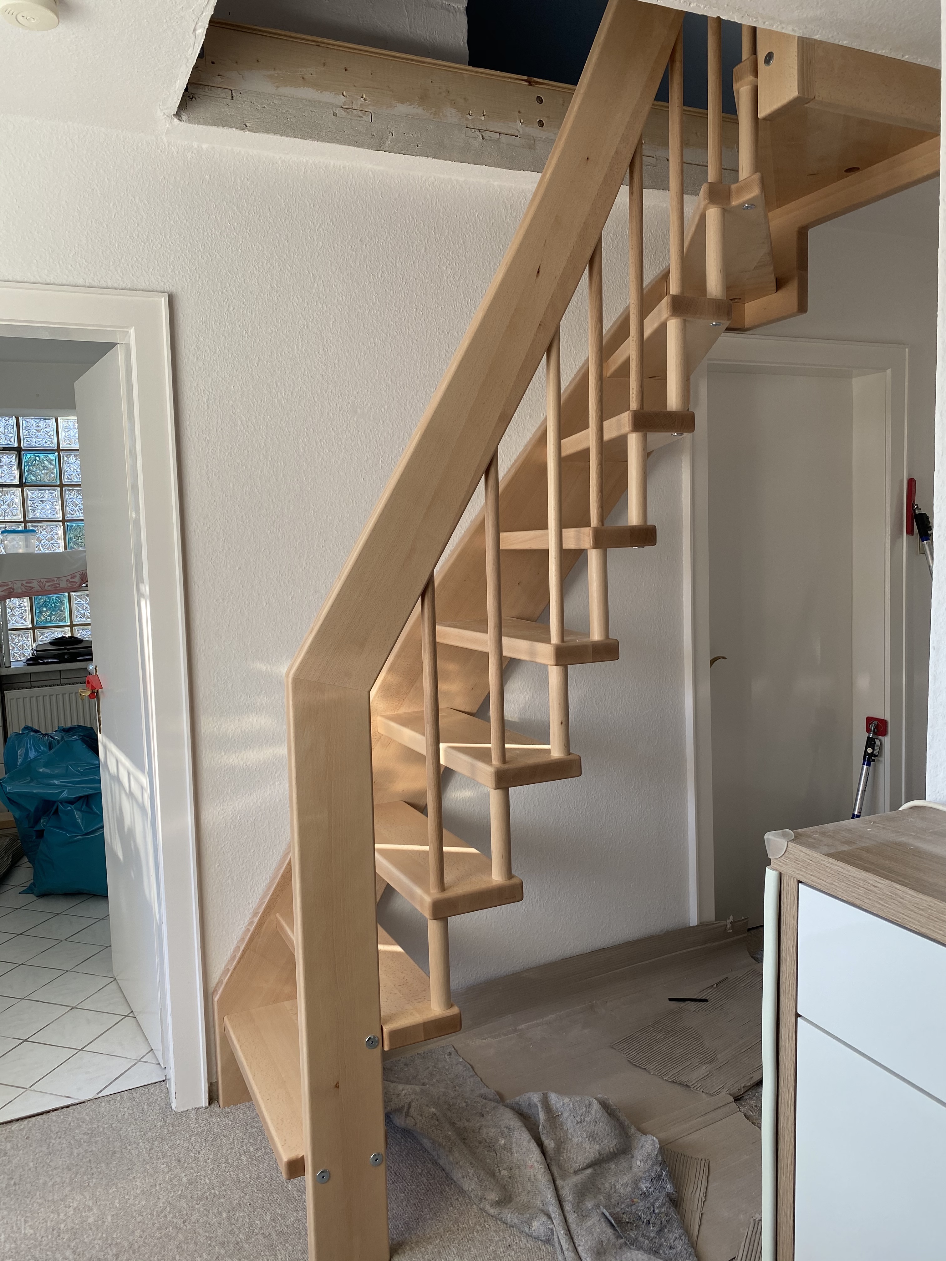 Raumspartreppe, hier als Bolzentreppe mit wandseitiger Wange auf engstem Raum zwischen zwei Innentüren nach oben geführt, 1/4 gewendelt, Holzart: Buche farblos lackiert, Geländer mit senkrechten Holzrundstäben. Raumspartreppe, hier als Bolzentreppe mit wandseitiger Wange auf engstem Raum zwischen zwei Innentüren nach oben geführt, 1/4 gewendelt, Holzart: Buche farblos lackiert, Geländer mit senkrechten Holzrundstäben. -