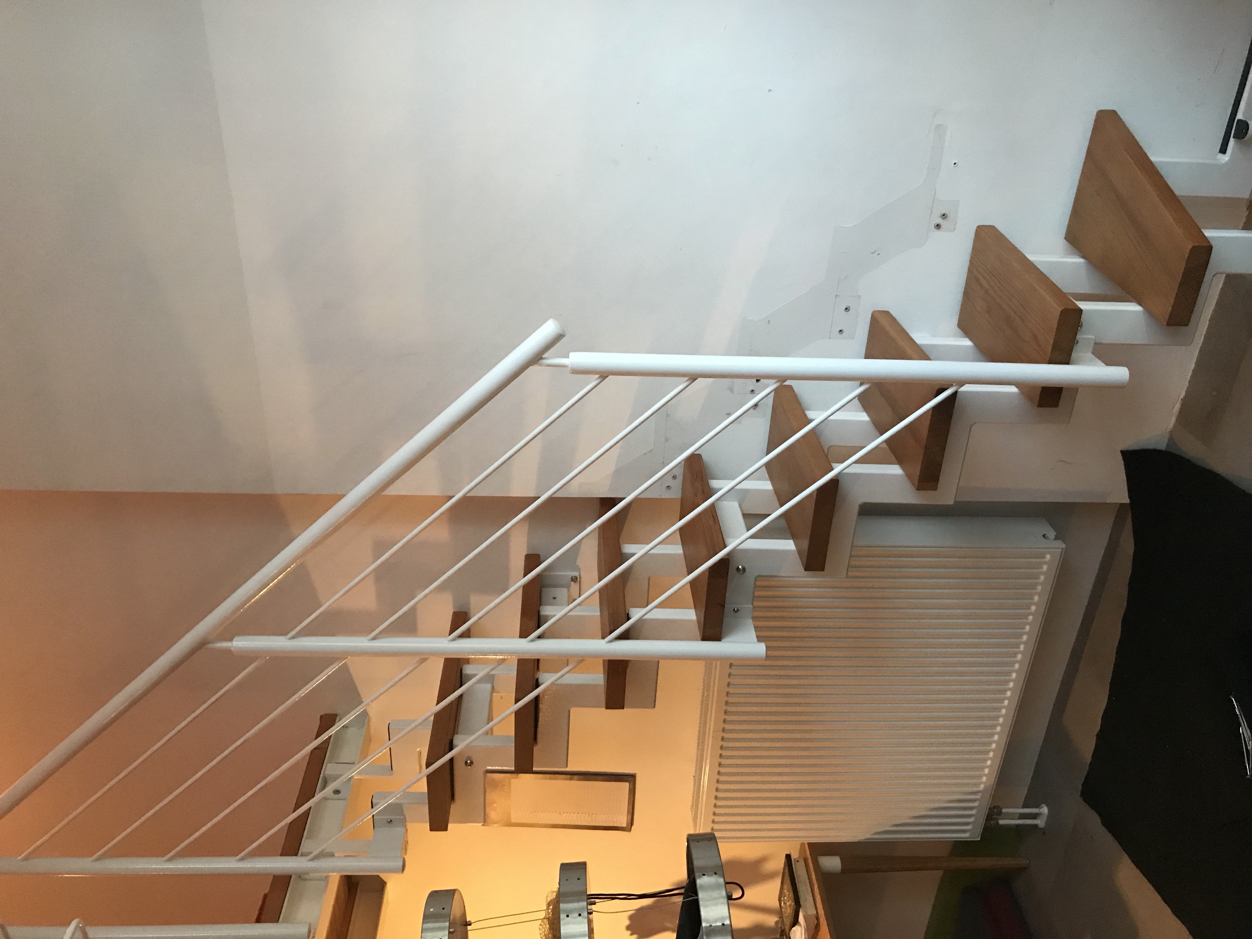 Raumspartreppe, hier als 60 cm breite Stahlholmtreppe mit Massivholzstufen und einem Stahl-Relinggeländer, Stahlholme und Geländer in weiß. Raumspartreppe, hier als 60 cm breite Stahlholmtreppe mit Massivholzstufen und einem Stahl-Relinggeländer, Stahlholme und Geländer in weiß. -