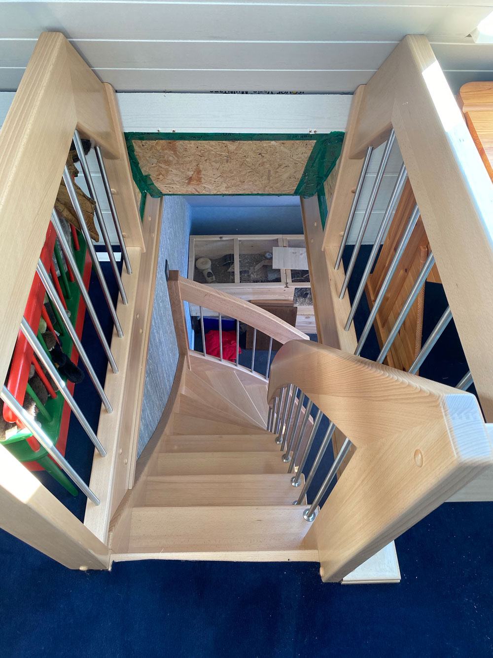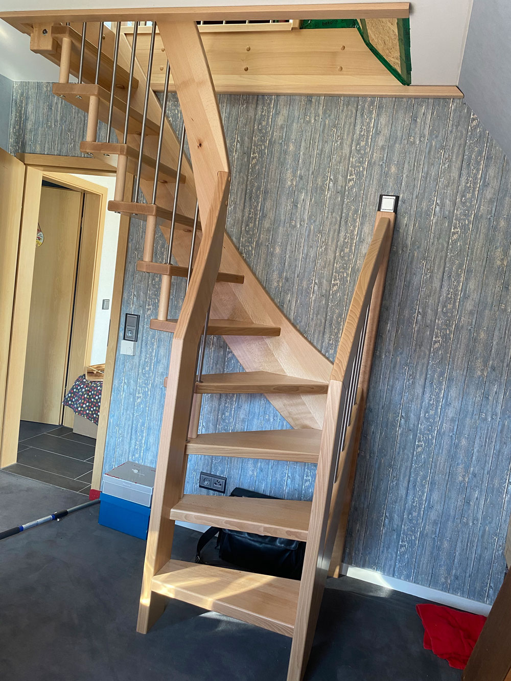 Raumspartreppe, hier als Bolzentreppe mit wandseitiger Wange auf engstem Raum zum Dachboden geführt, 1/4 gewendelt, Holzart: Buche farblos lackiert, Geländer mit senkrechten Edelstahlstäben. Raumspartreppe, hier als Bolzentreppe mit wandseitiger Wange auf engstem Raum zum Dachboden geführt, 1/4 gewendelt, Holzart: Buche farblos lackiert, Geländer mit senkrechten Edelstahlstäben. -