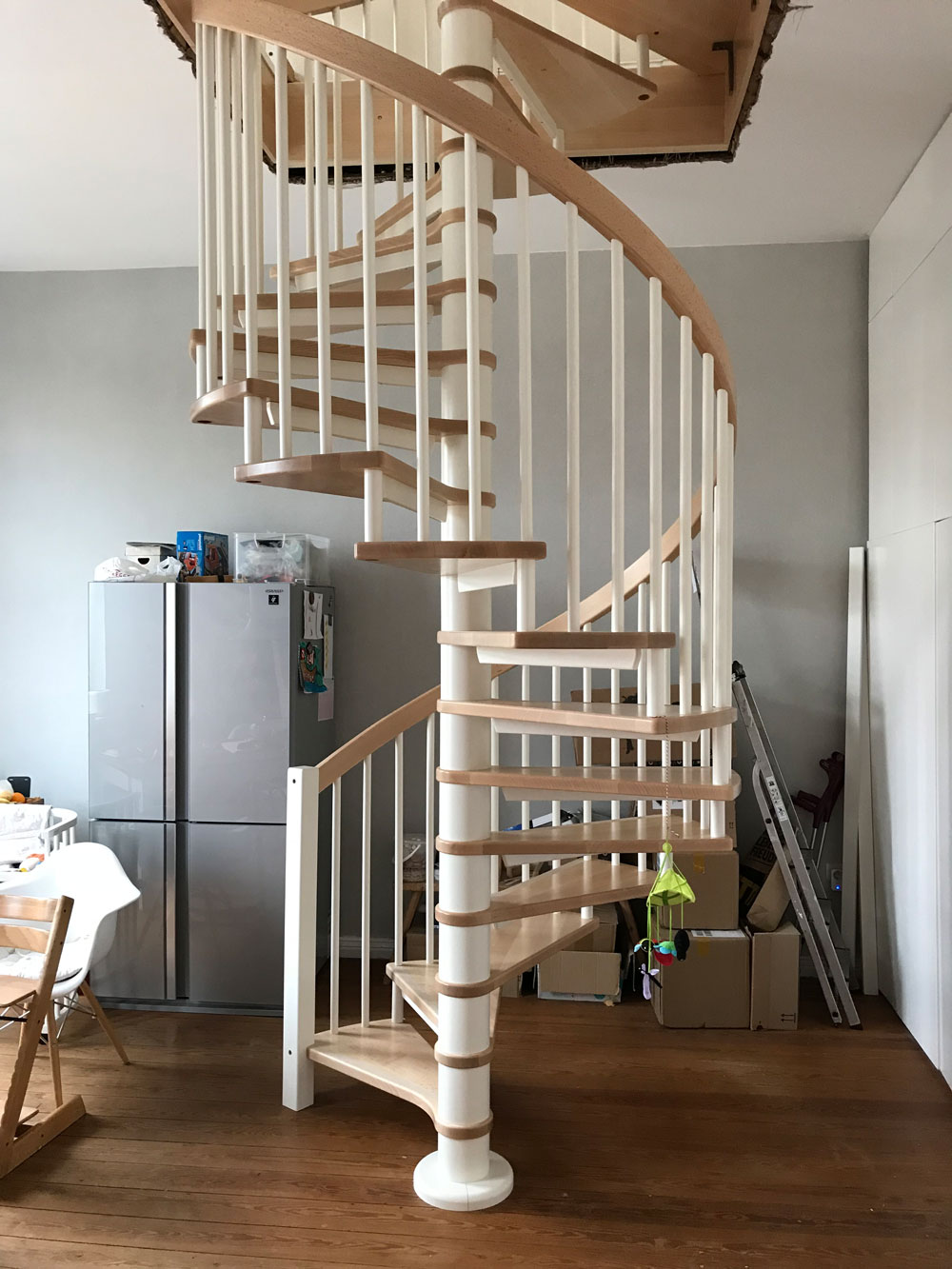Spindeltreppe aus Massivholz, Durchmesser 160 cm, mit senkrechten Holzrundstäben und einem Massivholzhandlauf. Holzart Stufen und Handlauf: Buche natur lackiert, Spindel und Geländerstäbe weiß deckend lackiert. Spindeltreppe aus Massivholz, Durchmesser 160 cm, mit senkrechten Holzrundstäben und einem Massivholzhandlauf. Holzart Stufen und Handlauf: Buche natur lackiert, Spindel und Geländerstäbe weiß deckend lackiert. -