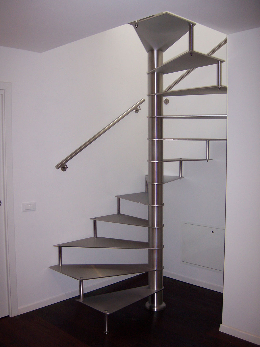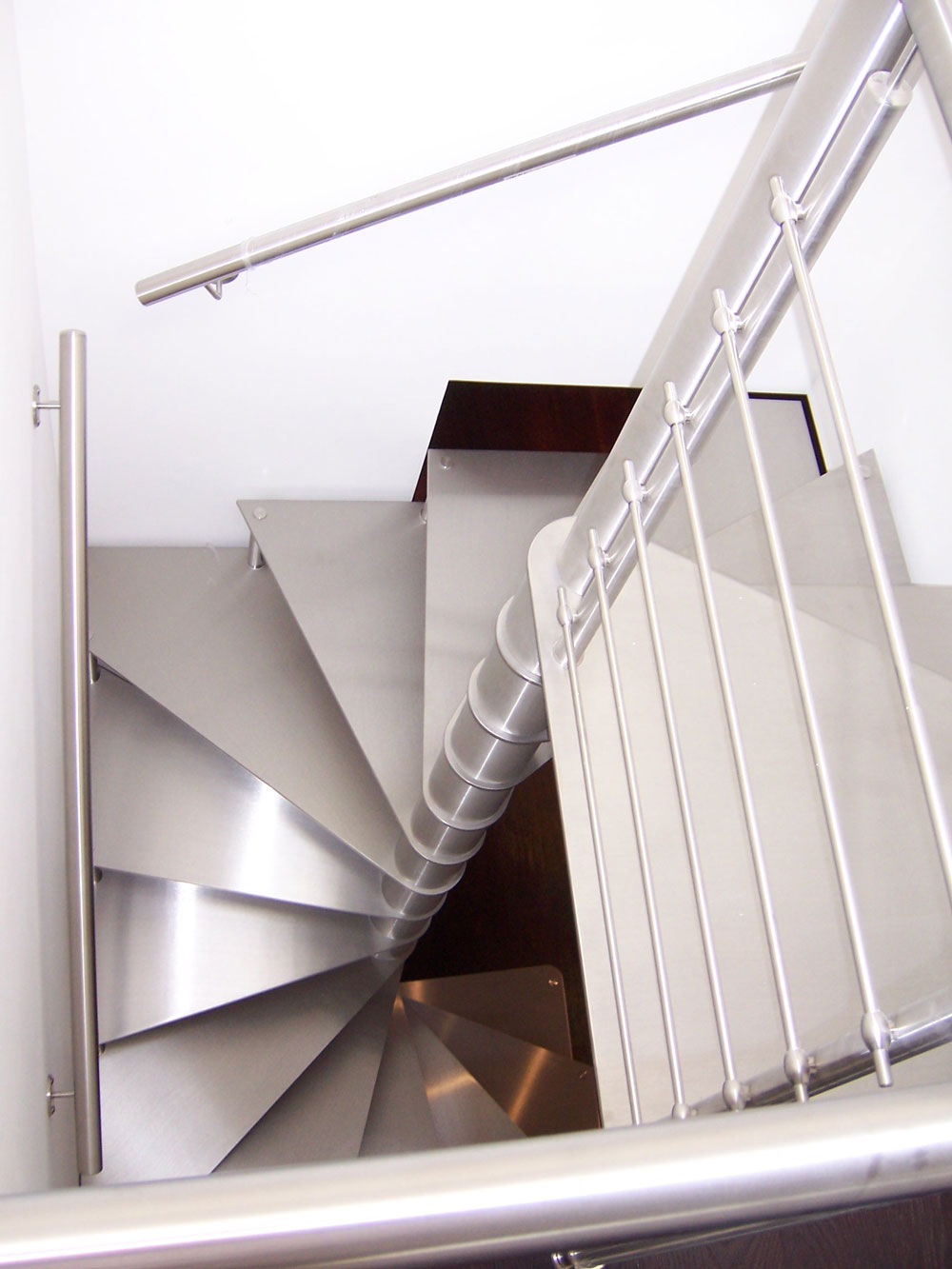Edelstahlspindeltreppe mit rechteckigem Grundriss, auch Stufen aus Edelstahl. Edelstahlspindeltreppe mit rechteckigem Grundriss, auch Stufen aus Edelstahl. -