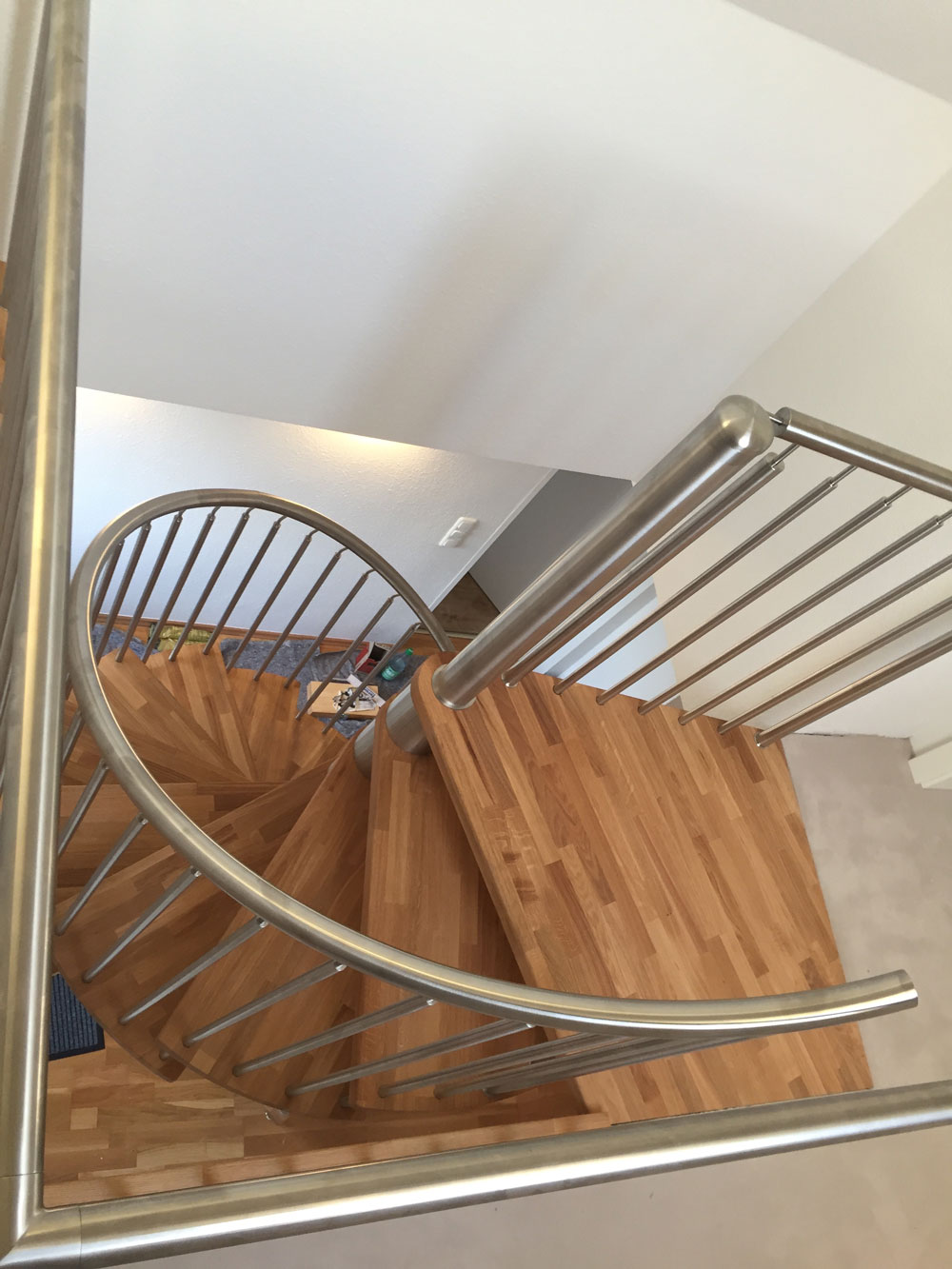 Spindeltreppe aus Massivholz, Durchmesser 150 cm, mit senkrechten Edelstahlstäben und einem aufgedorntem Edelstahlhandlauf. Holzart Spindel und Stufen: Buche natur lackiert. Spindeltreppe aus Massivholz, Durchmesser 150 cm, mit senkrechten Edelstahlstäben und einem aufgedorntem Edelstahlhandlauf. Holzart Spindel und Stufen: Buche natur lackiert. -