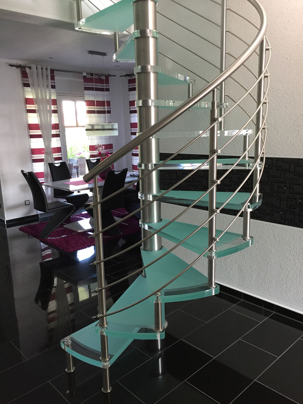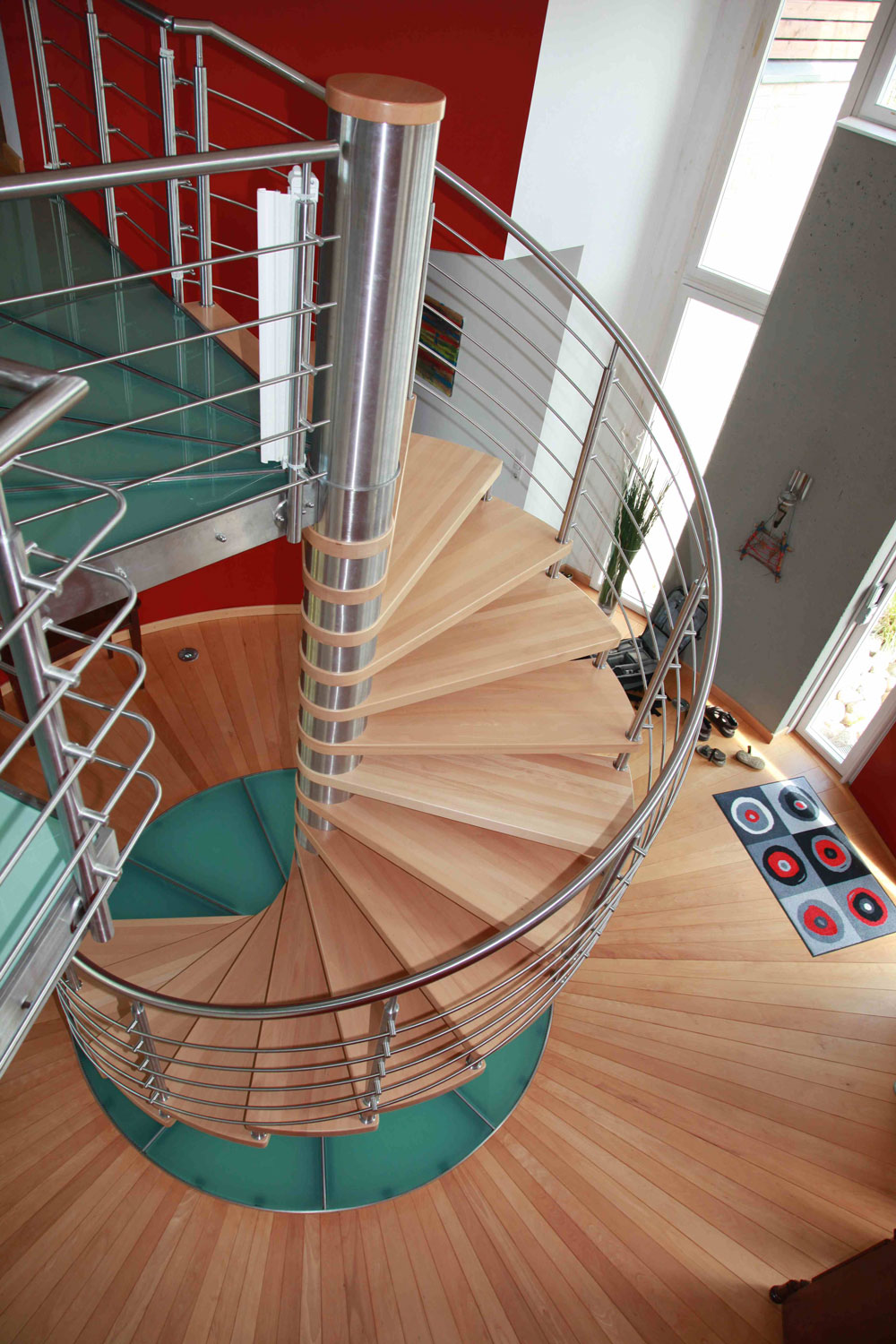Spindeltreppe in Edelstahl mit Stufen in Buche natur geölt. Treppe mit Durchmesser 250 cm. Fussboden unter der Treppe und das große Austrittspodest mit begehbaren Glaseinlagen in Tortenform. Glas mit farbiger Folie. Von dem Austrittspodest aus gelangt man in 3 verschiedenen Bereichen des Obergeschoßes. Edelstahlrelinggeländer mit Edelstahlhandlauf. Podestkonstruktion ebenfalls in Edelstahl. Spindeltreppe in Edelstahl mit Stufen in Buche natur geölt. Treppe mit Durchmesser 250 cm. Fussboden unter der Treppe und das große Austrittspodest mit begehbaren Glaseinlagen in Tortenform. Glas mit farbiger Folie. Von dem Austrittspodest aus gelangt man in 3 verschiedenen Bereichen des Obergeschoßes. Edelstahlrelinggeländer mit Edelstahlhandlauf. Podestkonstruktion ebenfalls in Edelstahl. -